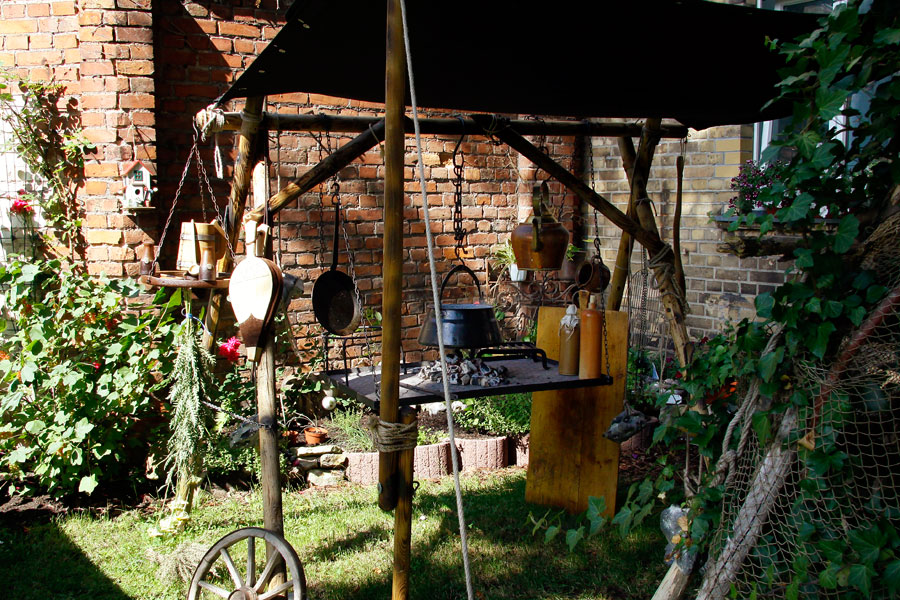 Wenn wir länger unser Lager aufbauen ist unsere Kochstelle unverzichtbar, sie wird an der Stirnseite der Bude aufgebaut, somit verlängert sich der Platzbedarf um 2 m.