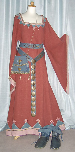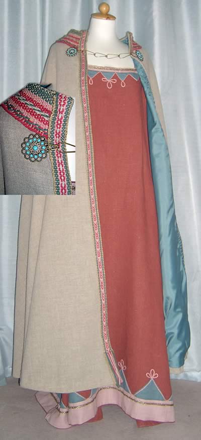 Alle Teile sind Unikate. Das Kleid ist aus schwerem Leinen gearbeitet. Die blauen und rosa Applikationen und Besätze habe ich von Hand aufgenäht. Inzwischen ziert die Ärmel zusätzlich eine eigens entworfene Brettchenborte. Die kleinen Ornamente entstanden aus dickem BW-Garn, welches ich mit kleinen Stichen aufnähte. Für den leichten Wollumhang habe ich farblich abgestimmt Borten und Kragenbesatz gewebt (einfach auf einer Styroporplatte-wenn auch nicht stilecht). Die Schuhe sind hangenäht und sollten Probestücke sein. Nun habe ich sie schon bei jedem Markt geschleppt und sie halten, halten...